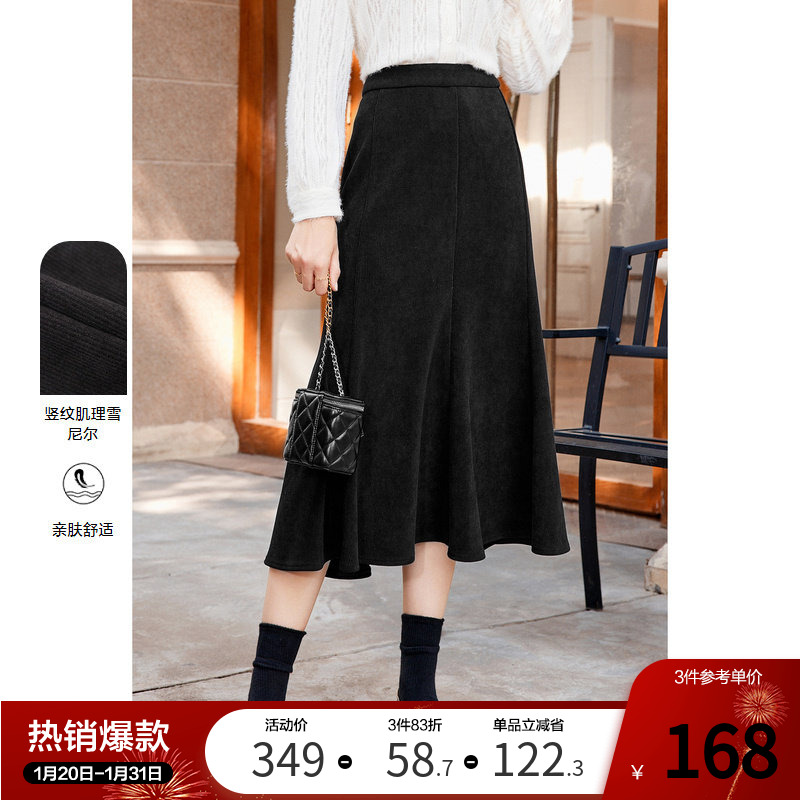 百图女装2025年冬季新款高腰显瘦鱼尾包臀通勤中长款雪尼尔半身裙