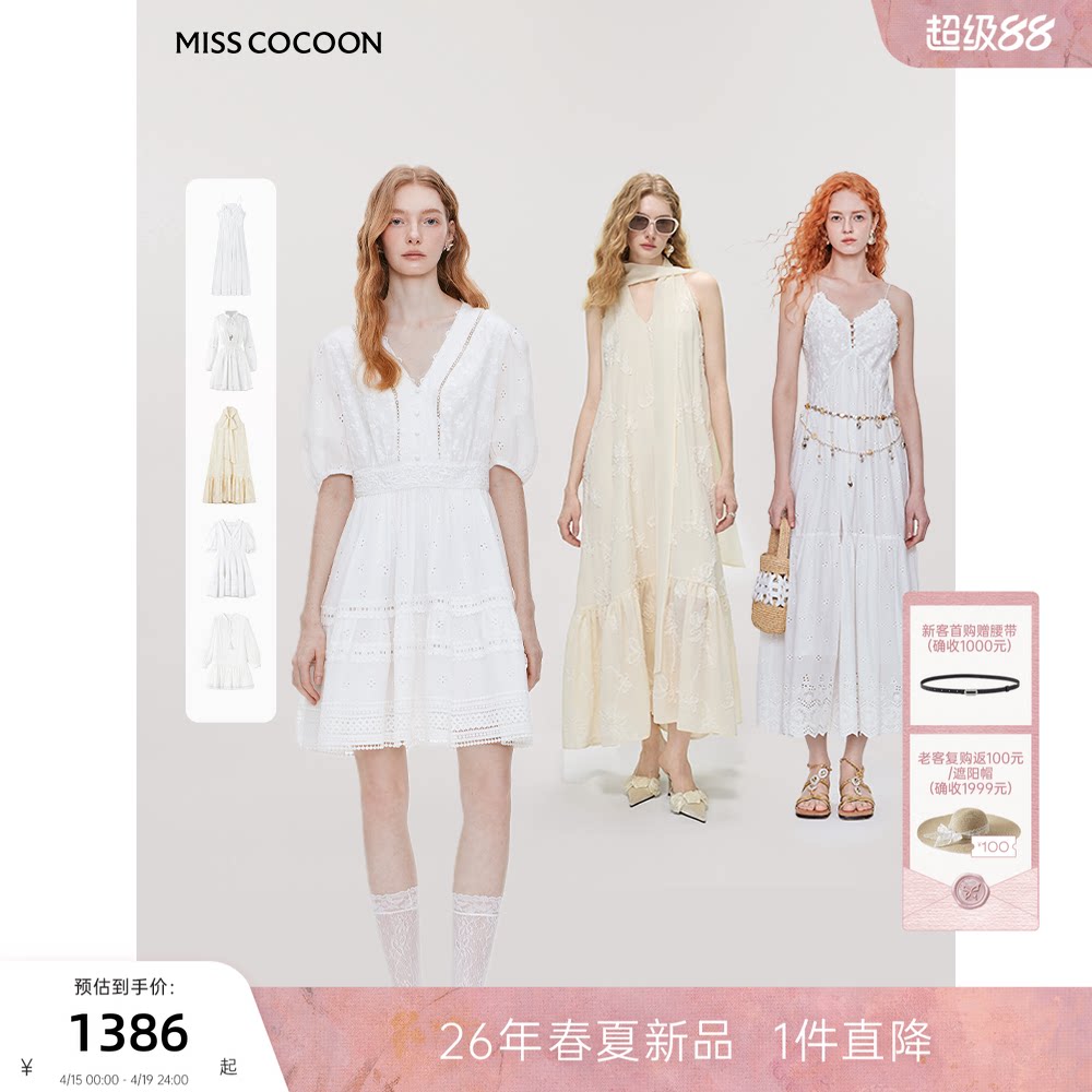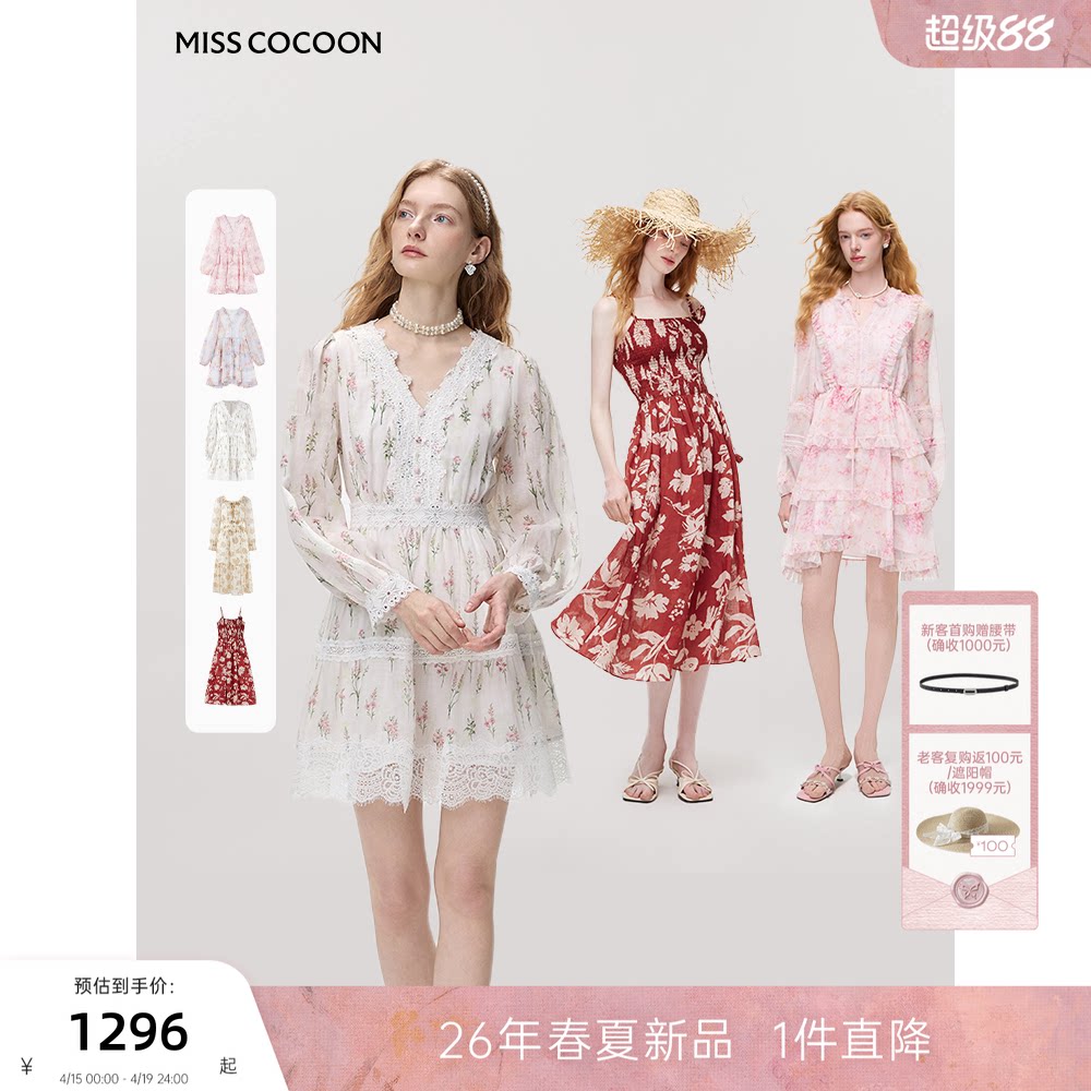 MISSCOCOON可可尼V领长袖碎花裙女26春新款田园风白色苎麻连衣裙
