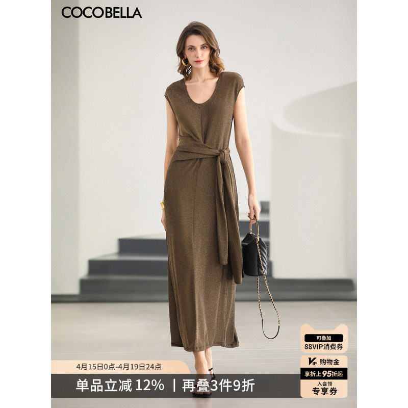 COCOBELLA时尚U领金色针织连衣裙女26春夏绑带收腰长裙FR7021