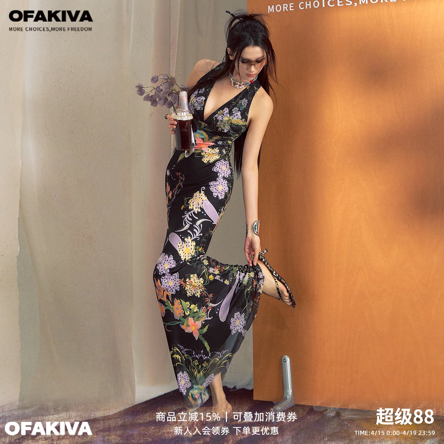 OfAkiva“繁花”浪漫法式挂脖连衣裙女春夏V领辣妹感包臀鱼尾长裙