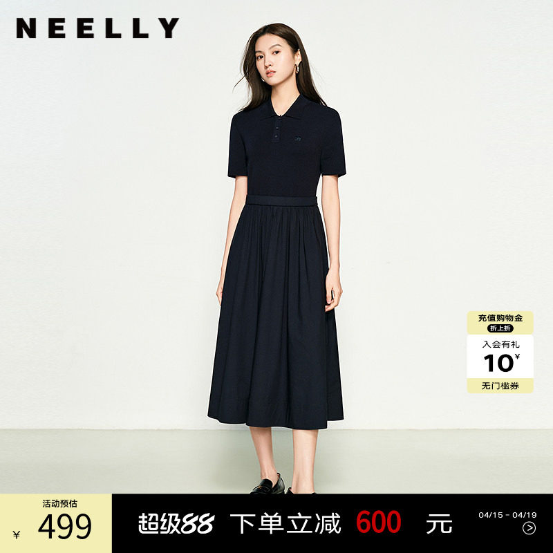 NEELLY纳俪商场同款春季新款翻领收腰百搭连衣裙女通勤气质长裙