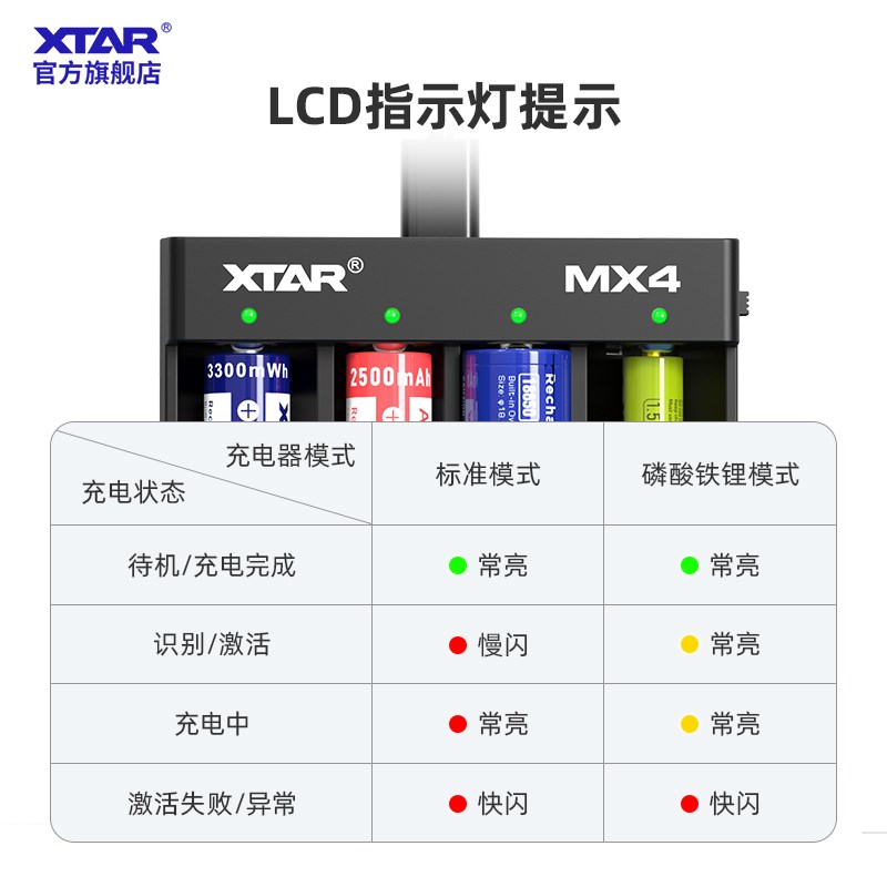 XTAR MX4 18650锂电池充电器1.2V5号7号镍氢电池/3.2V铁锂1.5V通