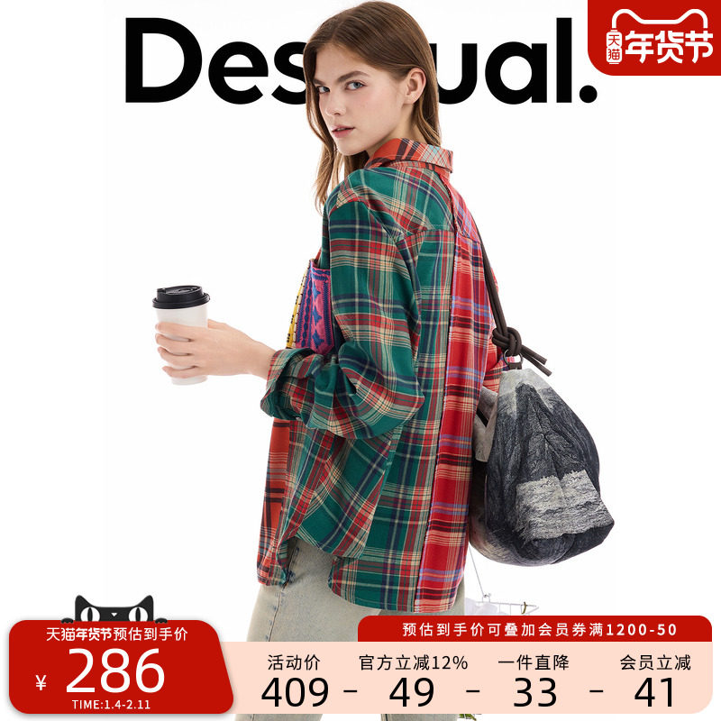 Desigual【明星同款】25秋冬新品格纹拼接长袖宽松女士衬衫