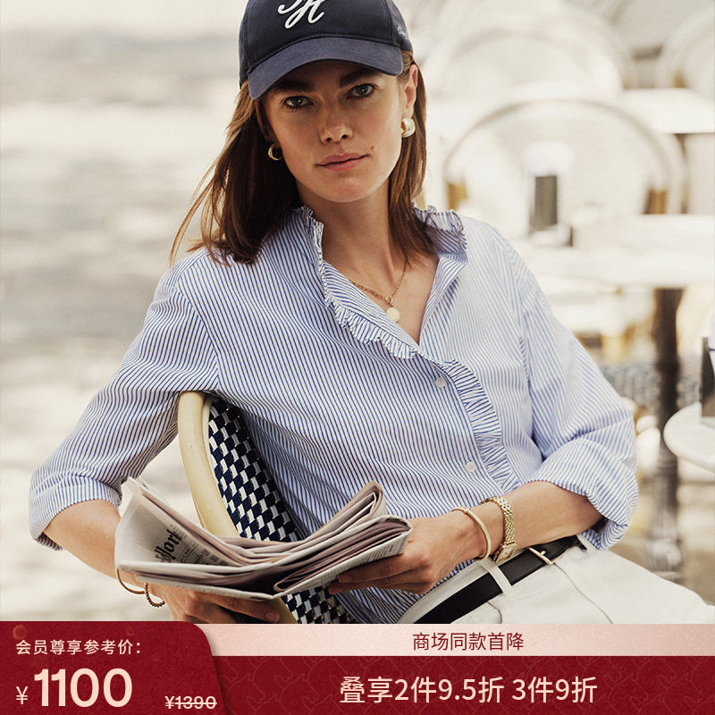 【明星同款】Tommy25秋冬女纯棉府绸荷叶边条纹宽松衬衫新年礼物