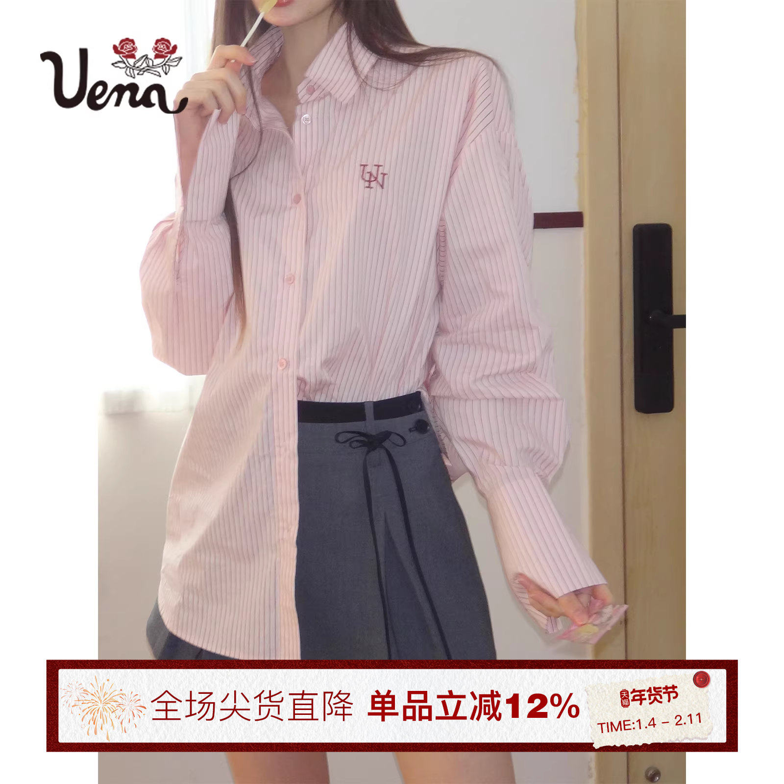 【芝芝莓莓】Uena明星同款学院风粉色条纹字母刺绣落肩长袖衬衫女