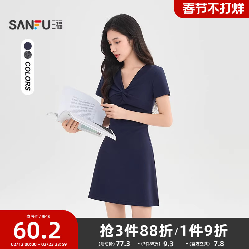 三福大方得体连衣裙2026新款夏季简约气质V领收腰显瘦短裙子女装