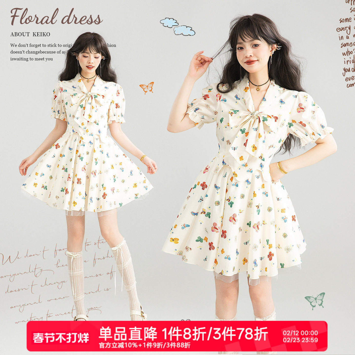 KEIKO 彩绘蝴蝶小碎花连衣裙26春夏法式系带领显瘦泡泡袖伞裙短裙