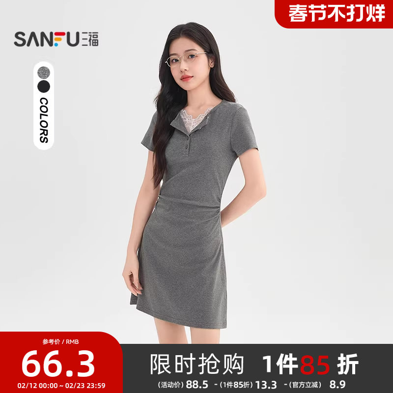 三福PoloV领连衣裙2026新款夏季收腰a字短裙显瘦修身包臀裙子女装