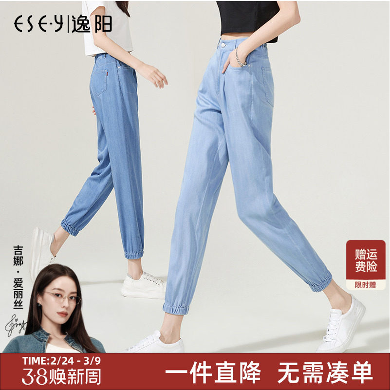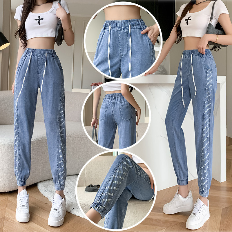天丝牛仔裤女2024春夏新薄款系带九分裤宽松哈伦裤冰丝束脚小脚裤