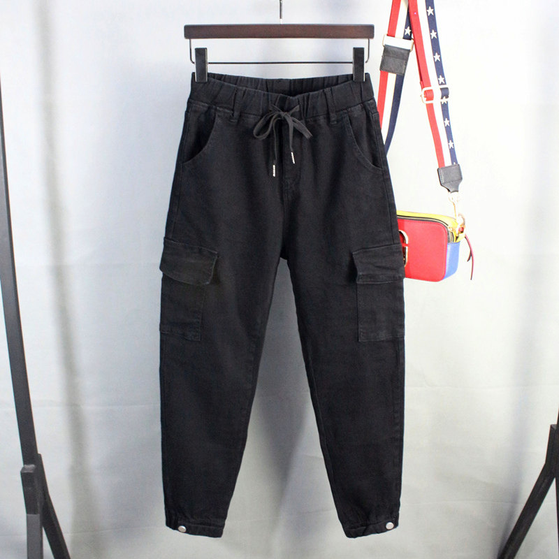 女宽松牛仔工装裤显瘦哈伦小脚休闲长裤多兜束脚弹力抽绳2025新款