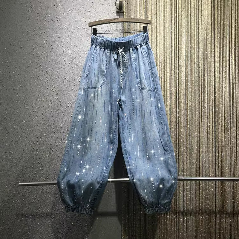 欧洲站2026春新款束脚牛仔裤女彩钻烫钻宽松大码天丝哈伦九分裤潮