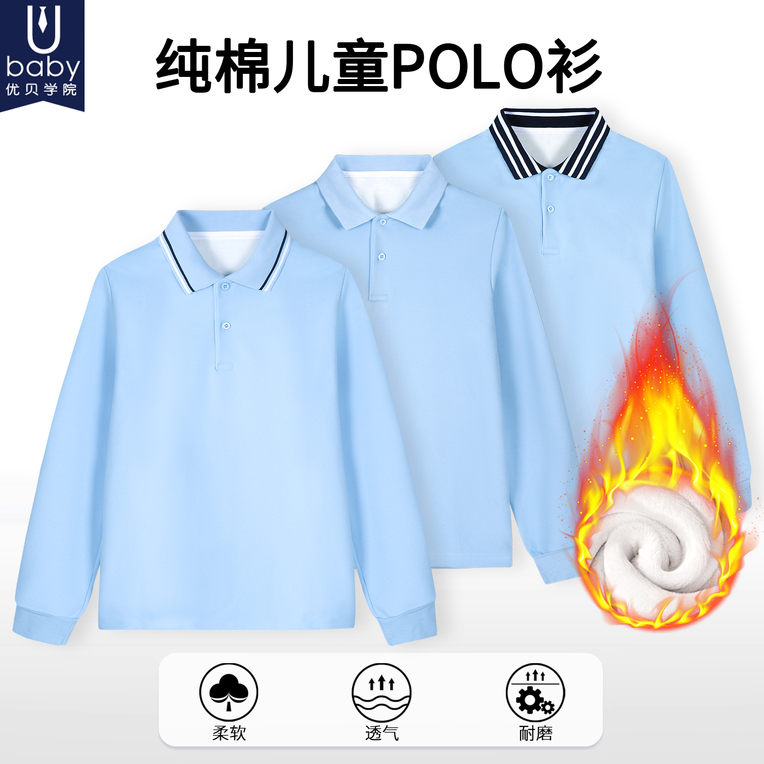 男女童t恤加绒翻领条纹长袖儿童polo衫纯棉班服浅蓝T恤小学生校服