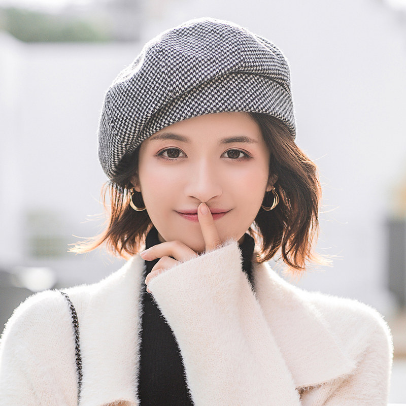 贝雷帽女秋冬季韩版百搭网红千鸟格子英伦复古日系春天画家帽子潮