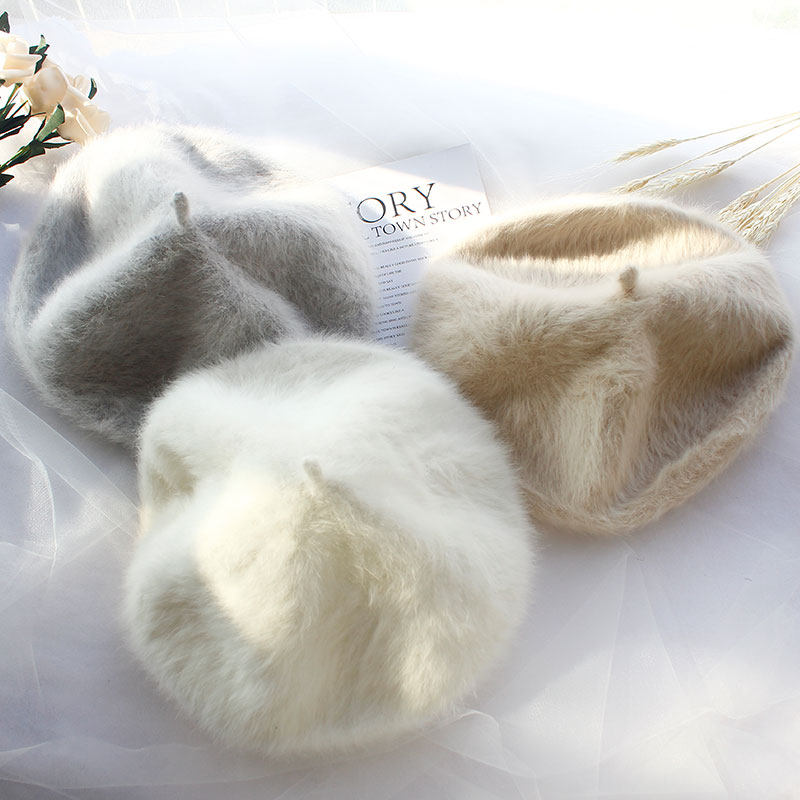 兔毛绒贝雷帽女韩版日系百搭貂绒软妹英伦针织画家帽子秋冬潮ins