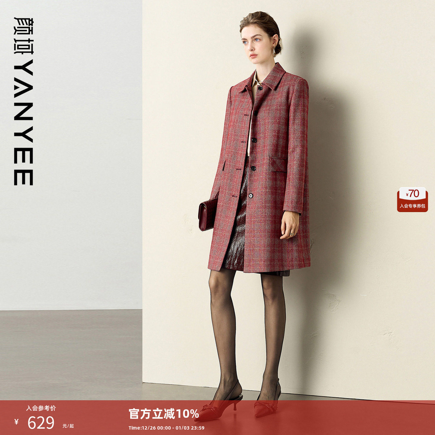 颜域红色格子中长款风衣女2025秋装新款通勤简约直筒修身大气外套