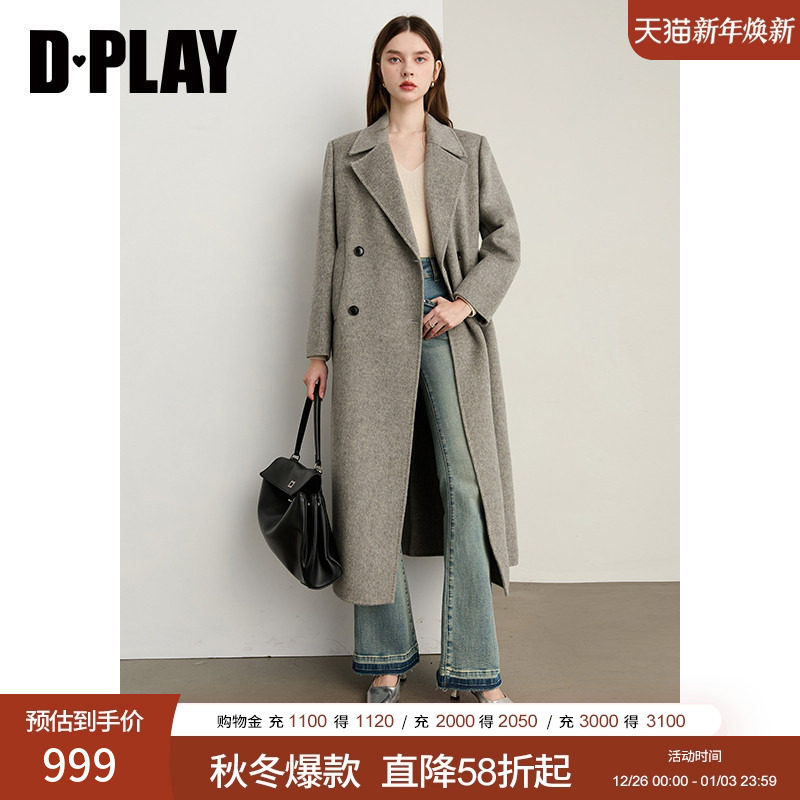 DPLAY2025年冬季新款灰色双面呢大衣女100羊毛中长款简约大气外套