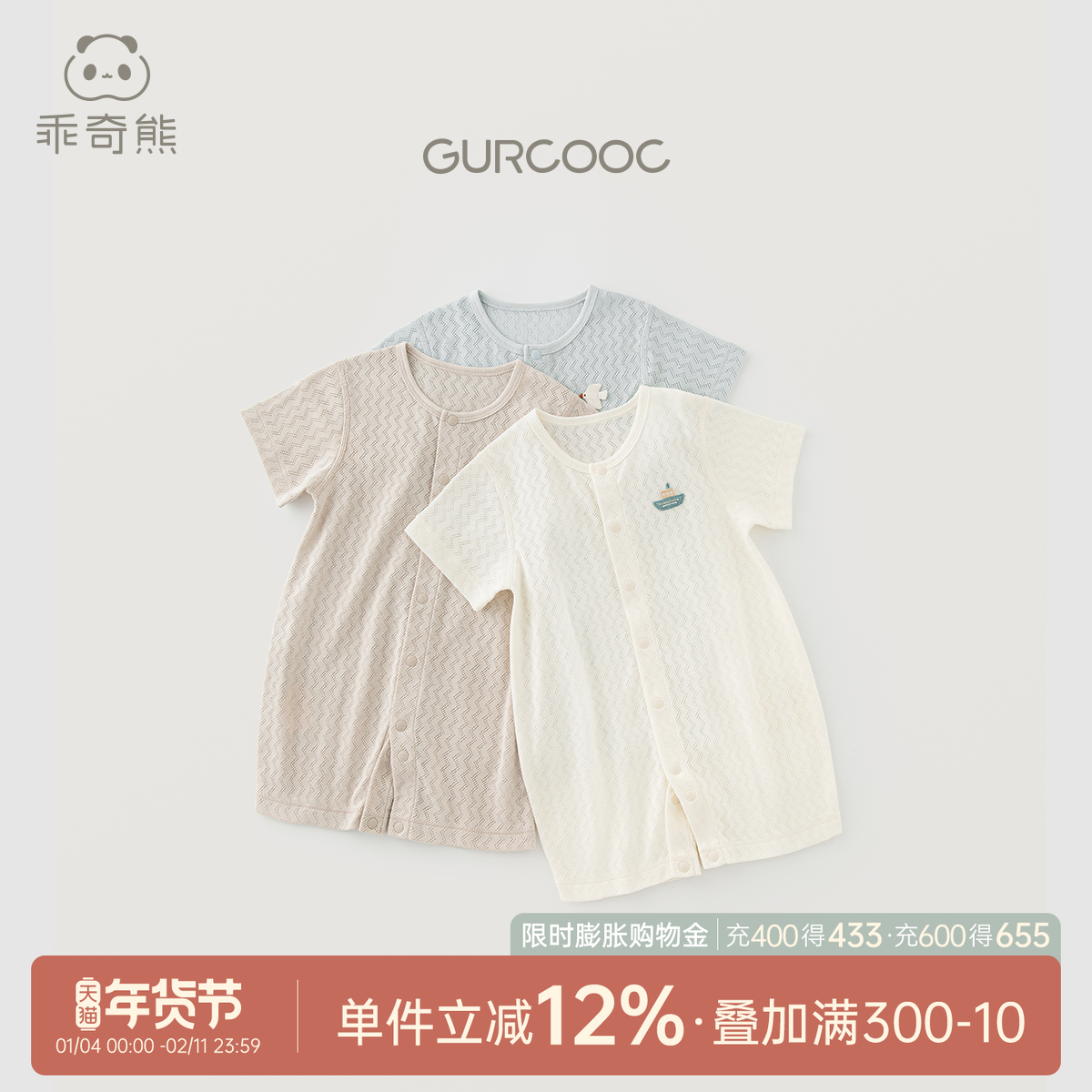 乖奇熊宝宝纯棉连体衣夏季薄款红色满月衣服婴儿短袖哈衣爬服周岁