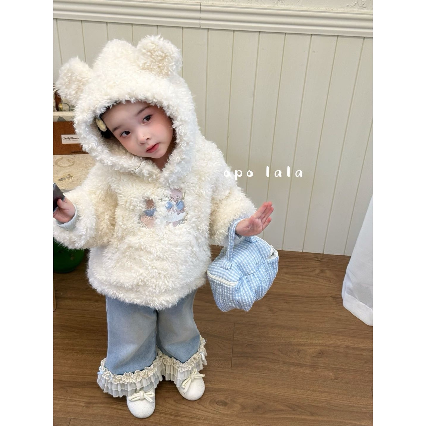 凡妈童装2025秋冬新款女童韩版可爱耳朵帽毛毛卫衣加绒牛仔直筒裤