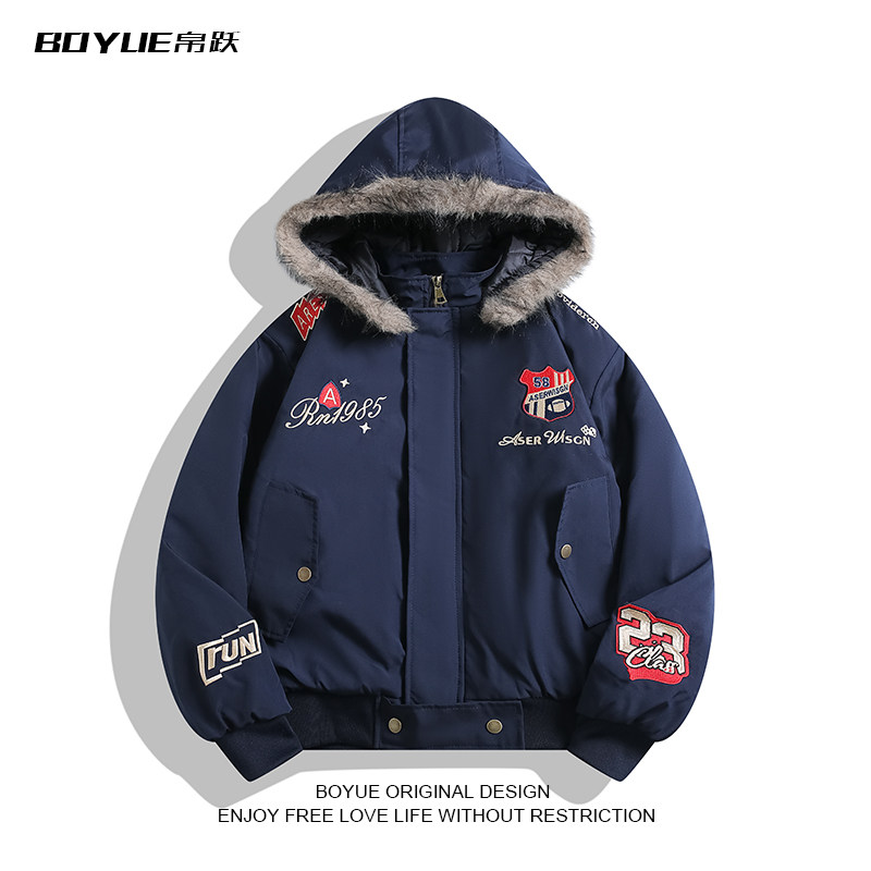 BOYUE帛跃国潮徽章刺绣连帽飞行夹克棒球服保暖工装痞帅男女棉衣