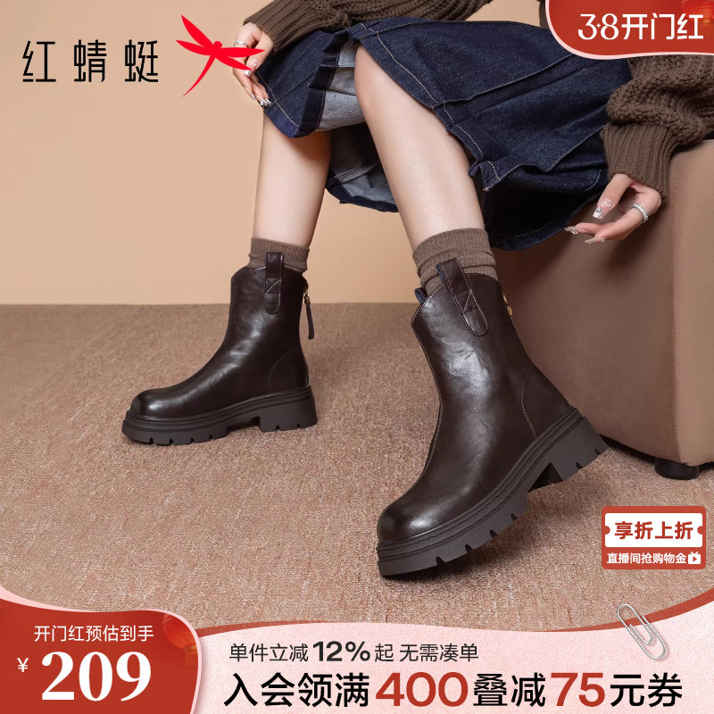 红蜻蜓靴子英伦厚底马丁靴女款新款秋冬季加绒保暖小短靴真皮女靴