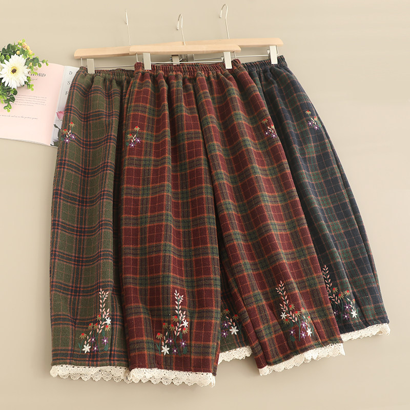 重工绣花格子九分裤女新款毛呢休闲裤子松紧腰加绒加厚哈伦裤 潮