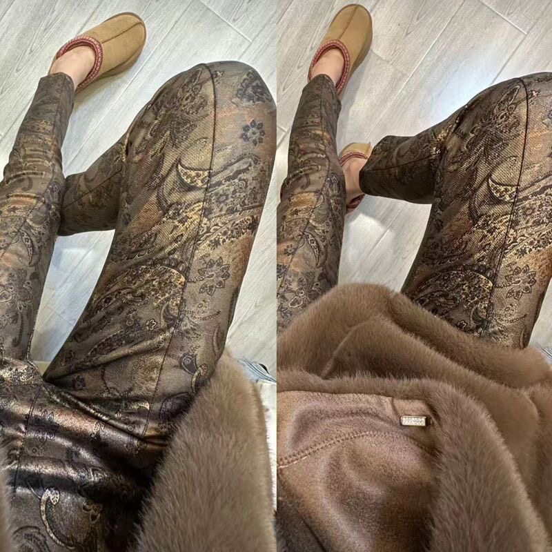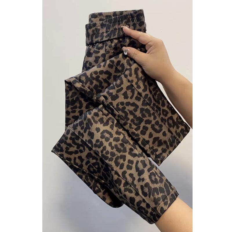 时尚豹纹印花铅笔裤女2024年秋冬新款竖线显瘦打底弹力涂层九分裤