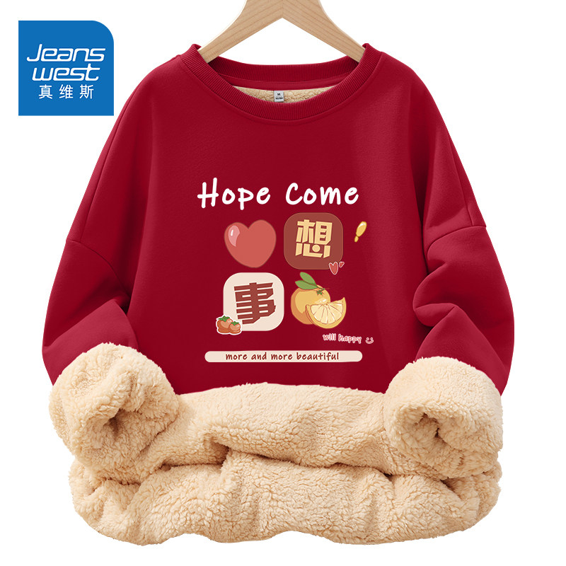 真维斯红色羊羔绒卫衣女秋冬2026新款加厚圆领外套马年本命年衣服