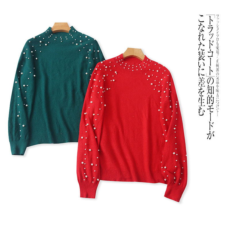I4341外贸欧美单女士毛衣秋冬新款半高圆领珍珠装饰宽松针织衫