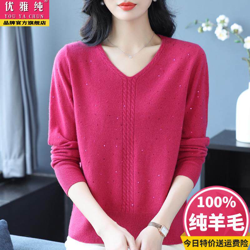 100纯羊毛衫女士毛衣秋冬季新款鸡心V领宽松打底衫妈妈高级上衣