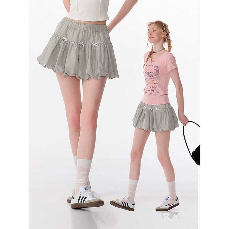 ziziFei夏季美式设计感蝴蝶结松紧腰百褶灰色a字花苞裙半身短裙女