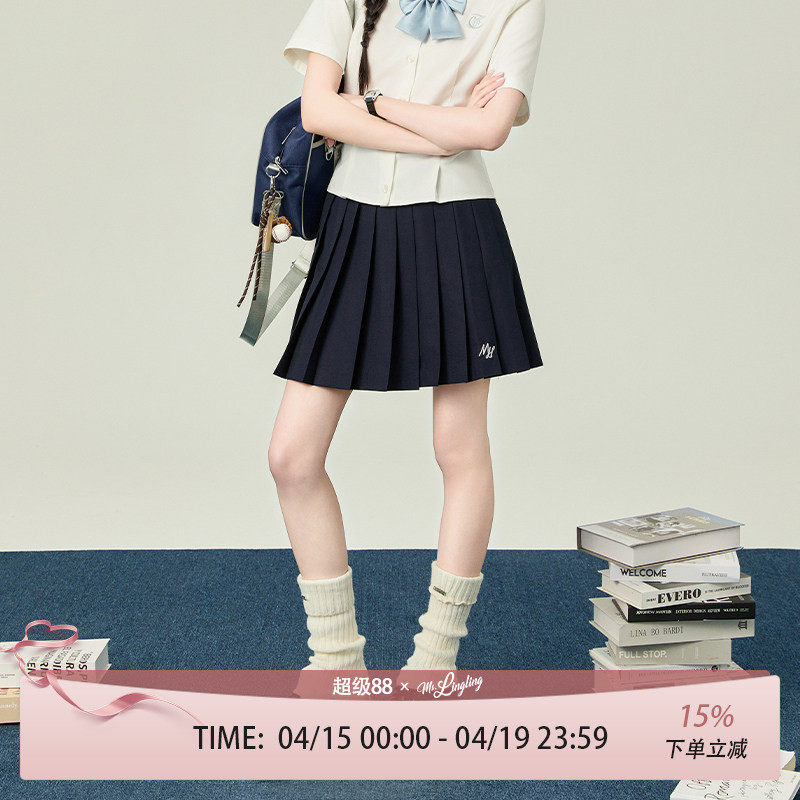 POLOWALK女式半裙2026春夏裤新品经典学院风刺绣百褶裙半身短裙