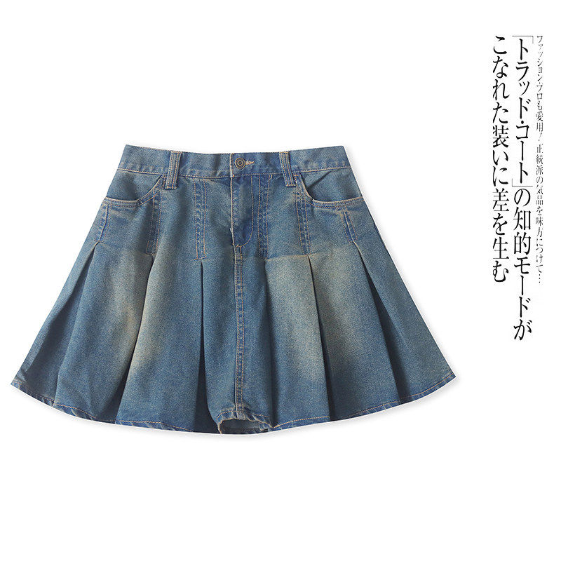 复古牛仔百褶裙女春夏新款减龄百搭高腰显瘦A字半身裙短裙防走光