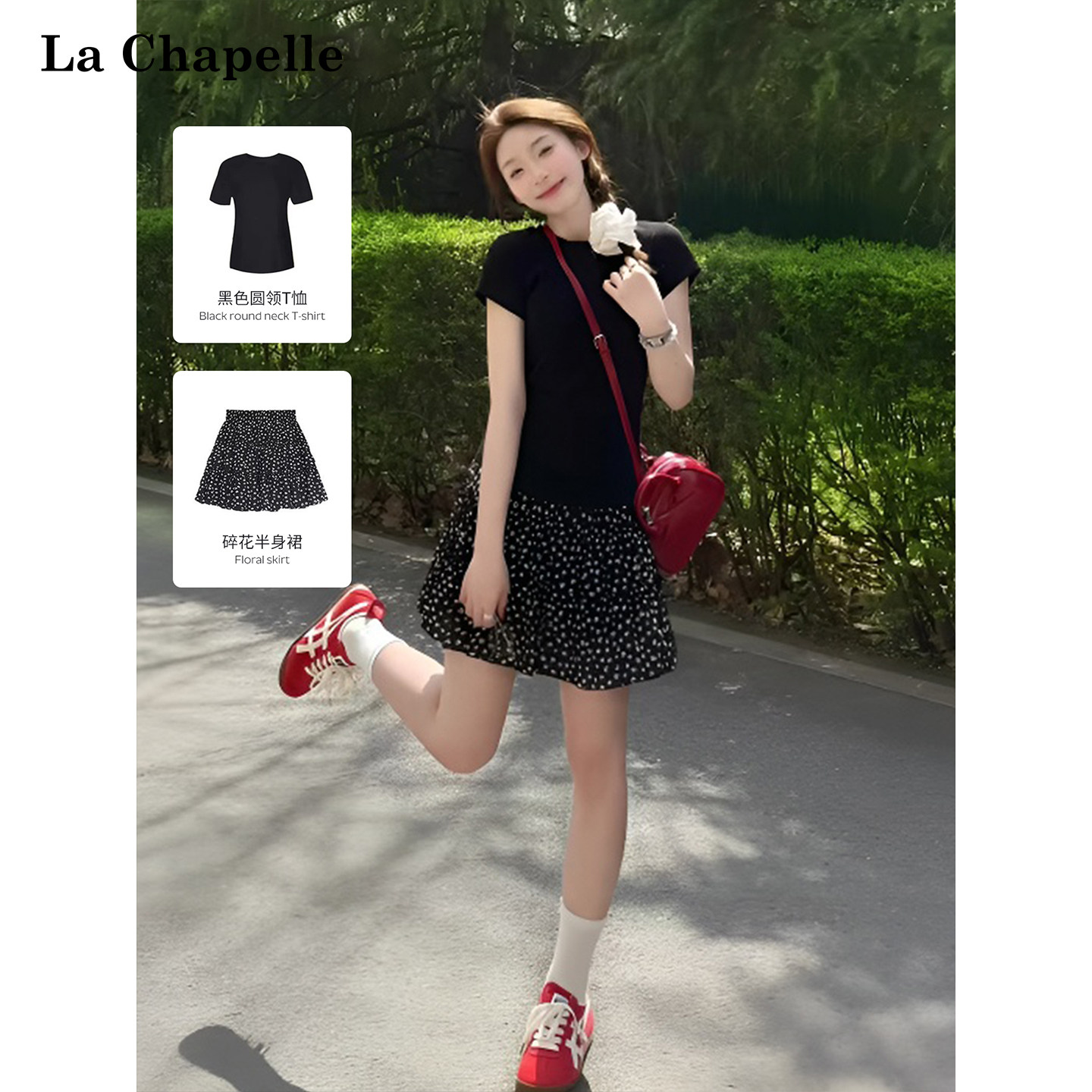 拉夏贝尔韩系黑色碎花短裙女生夏季新款蛋糕裙显瘦a字裙子半身裙