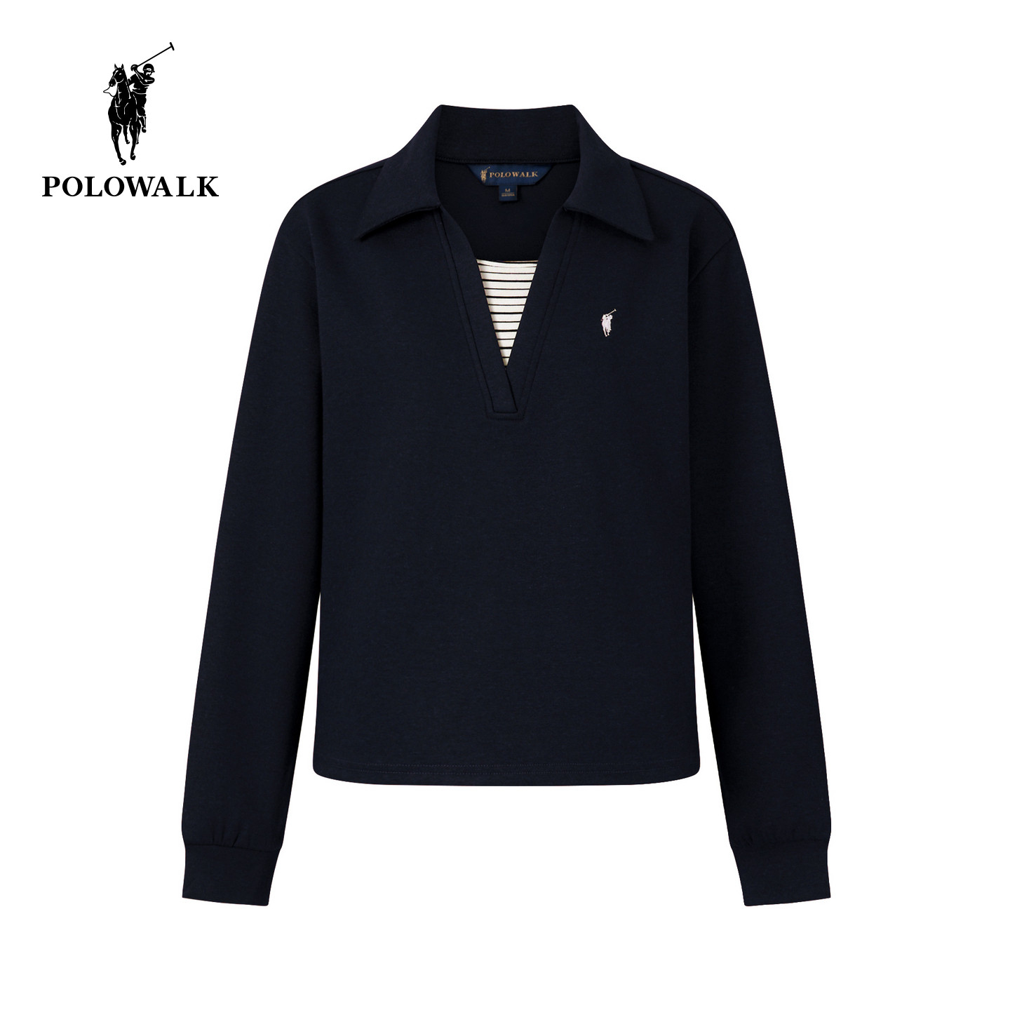 POLOWALK女式卫衣2025秋季新品翻领撞布拼接休闲通勤套头上衣女