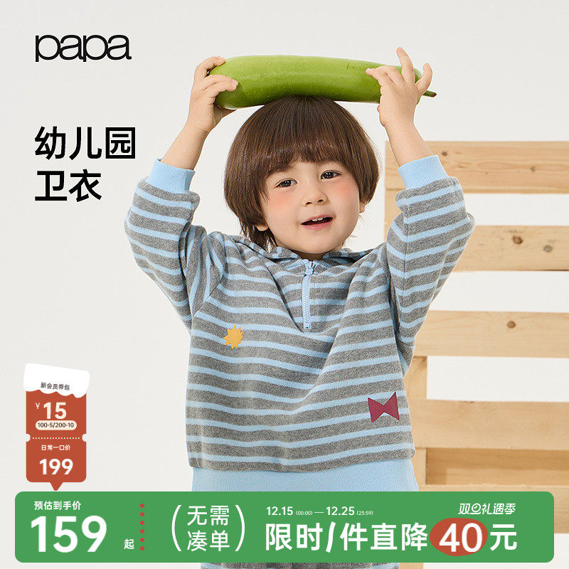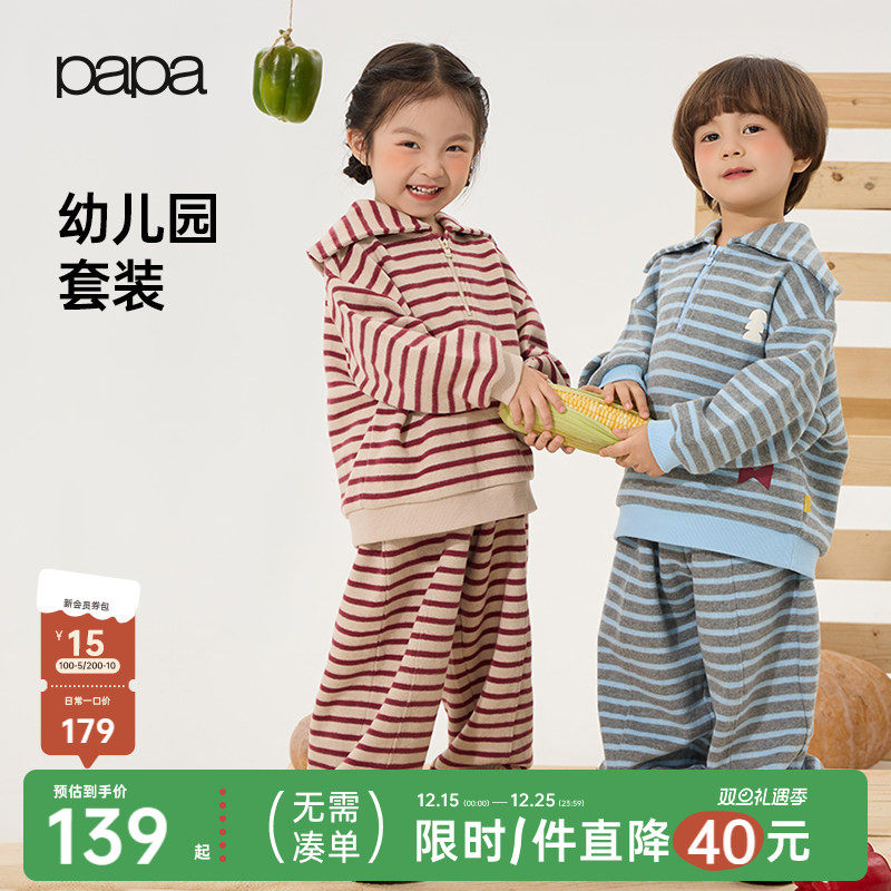 【新品】papa爬爬秋季儿童套装男女童洋气条纹海军领童装卫衣卫裤