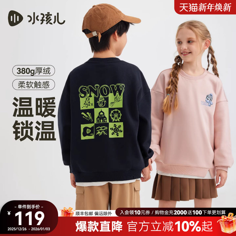 水孩儿童装加绒卫衣女童2025秋季新品男童一体绒套头上衣弹力打底