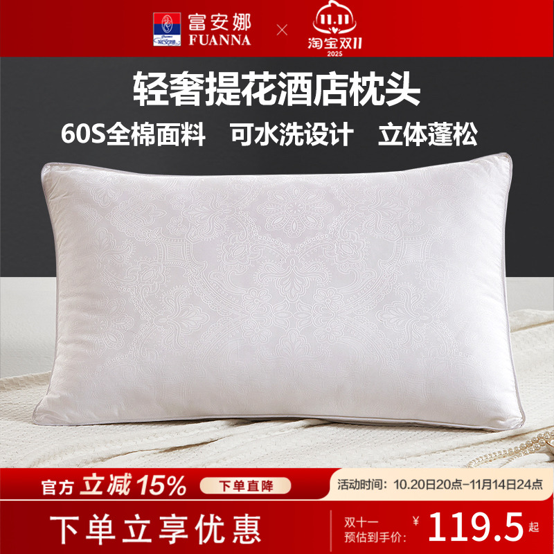 富安娜枕芯全棉纯棉成人护颈枕睡眠轻奢60支长绒棉枕头酒店专用