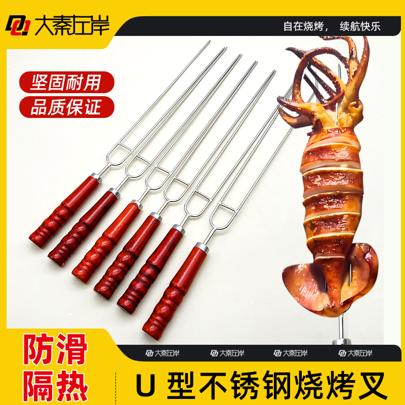 烧烤签子不锈钢U型烤鸡翅烤肉叉加厚木柄家用羊肉串叉子烤针工具