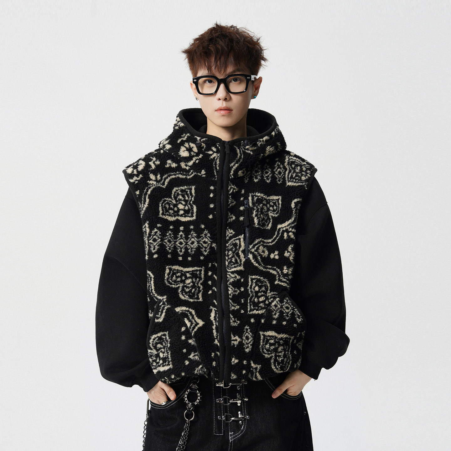 悟空有货潮牌冬季复古羊羔绒连帽棉衣马甲男宽松情侣保暖休闲马夹