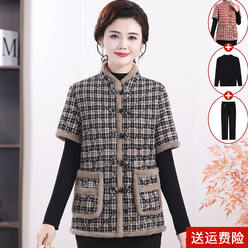 妈妈装秋冬新款加厚短袖棉服外套中老年女装加绒大码半袖棉衣马甲