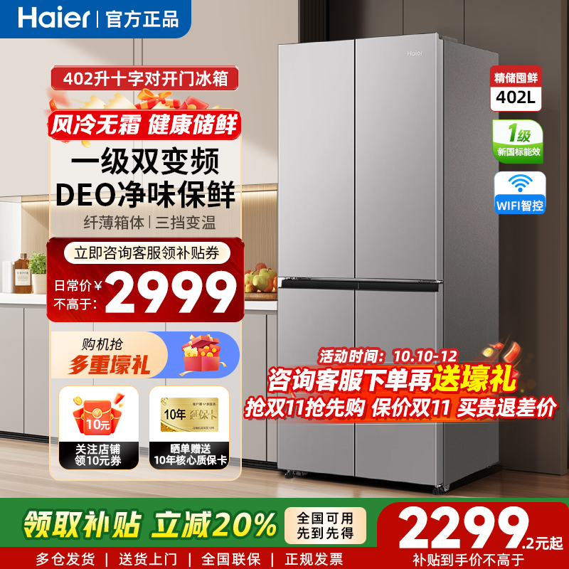 海尔402L十字对开门冰箱一级能效风冷无霜家用频大容量超薄嵌入式