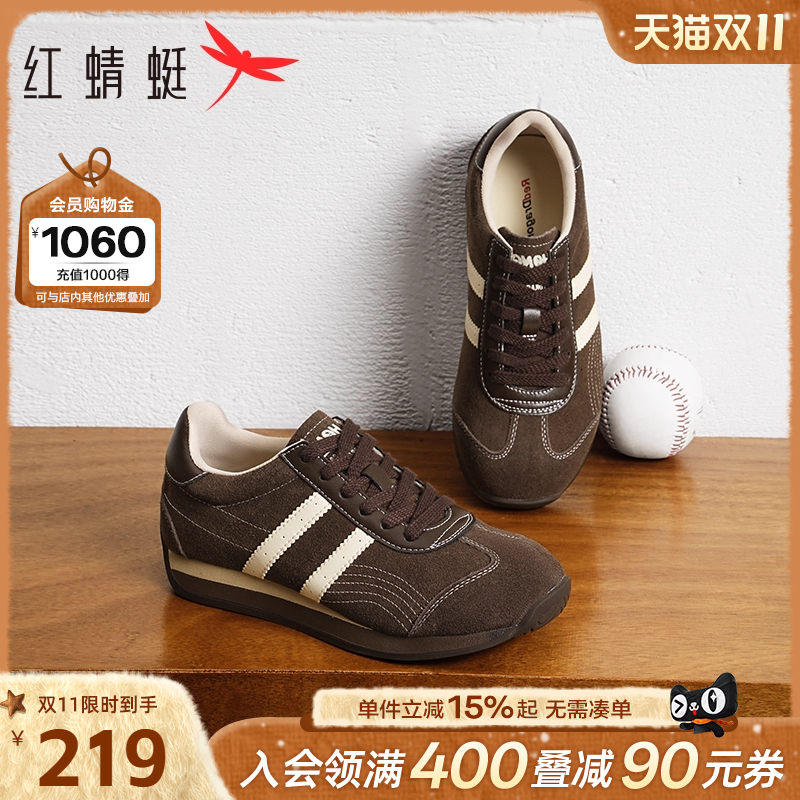 红蜻蜓红色德训鞋女2025春季新款平底系带休闲板鞋百搭运动阿甘鞋