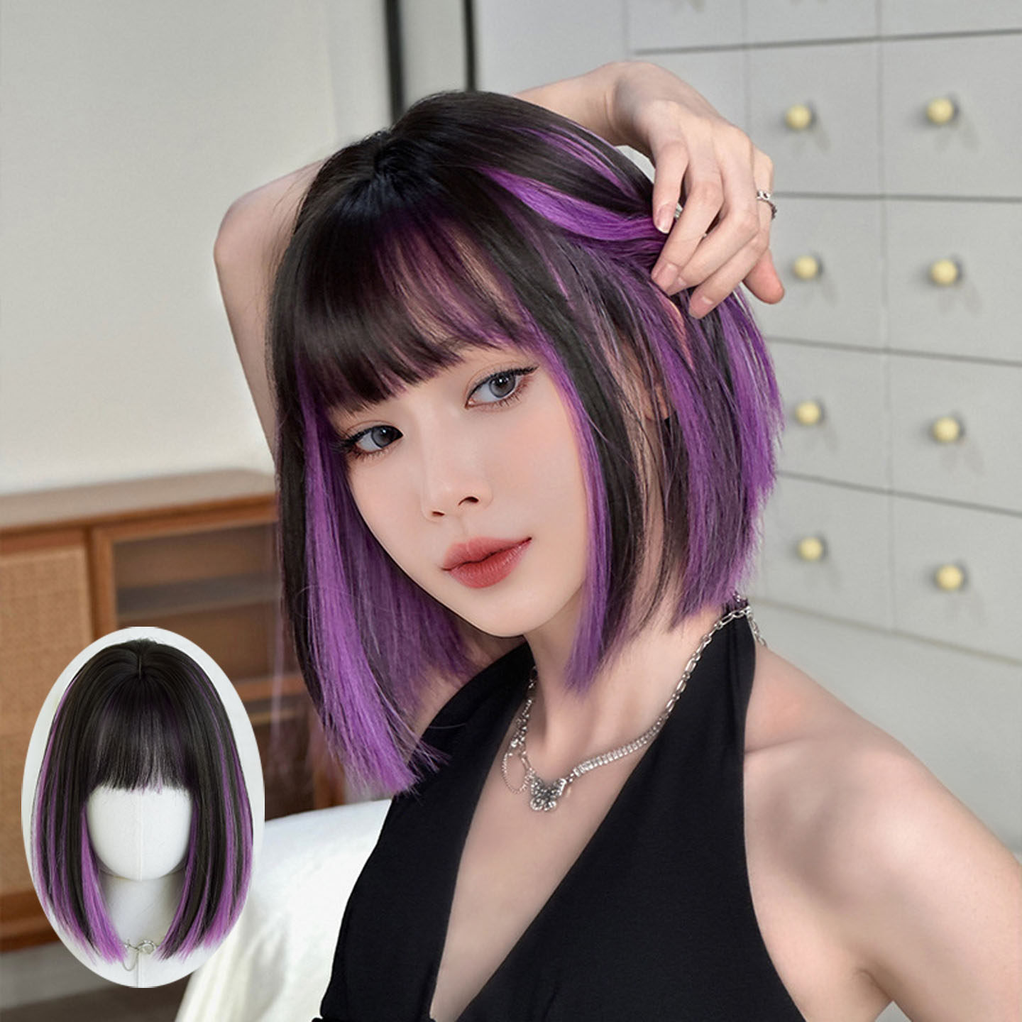 灵境紫挑染假发女齐刘海BOBO头短发假发全头套时尚酷炫短直发wigs