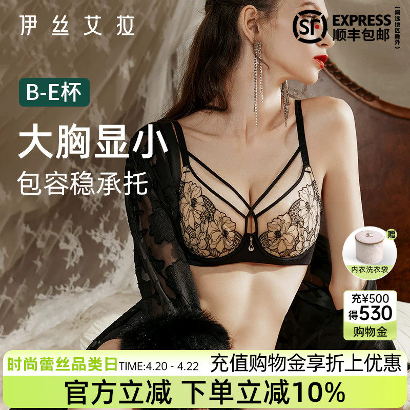 伊丝艾拉大胸显小胸内衣女性感纯欲黑色蕾丝聚拢防下垂超薄款文胸