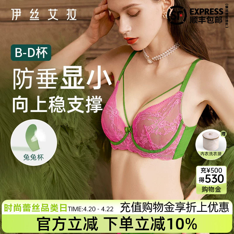 伊丝艾拉粉色文胸大胸显小兔耳杯性感胸罩超薄款蕾丝内衣女夏薄款