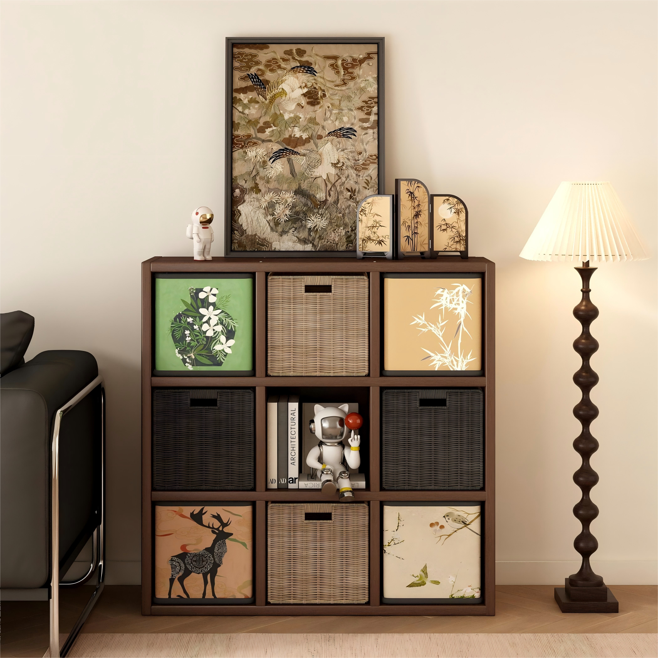 中古风黑胡桃木书柜自由组合客厅格子柜落地柜四格柜收纳柜展示柜