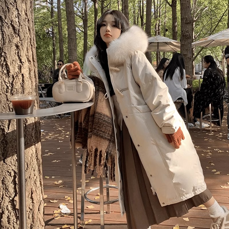 2025年新款韩版宽松木头扣防风加厚保暖中长款大毛领羽绒服外套女