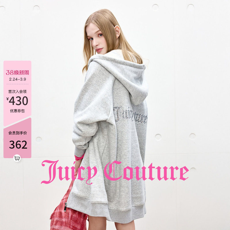 Juicy Couture橘滋外套女灰色宽松加绒刺绣长款连帽拉链开衫卫衣