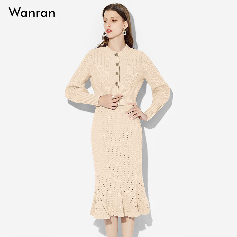 2025秋装新款时尚气质优雅灯笼袖毛衣外套+修身鱼尾针织半裙套装
