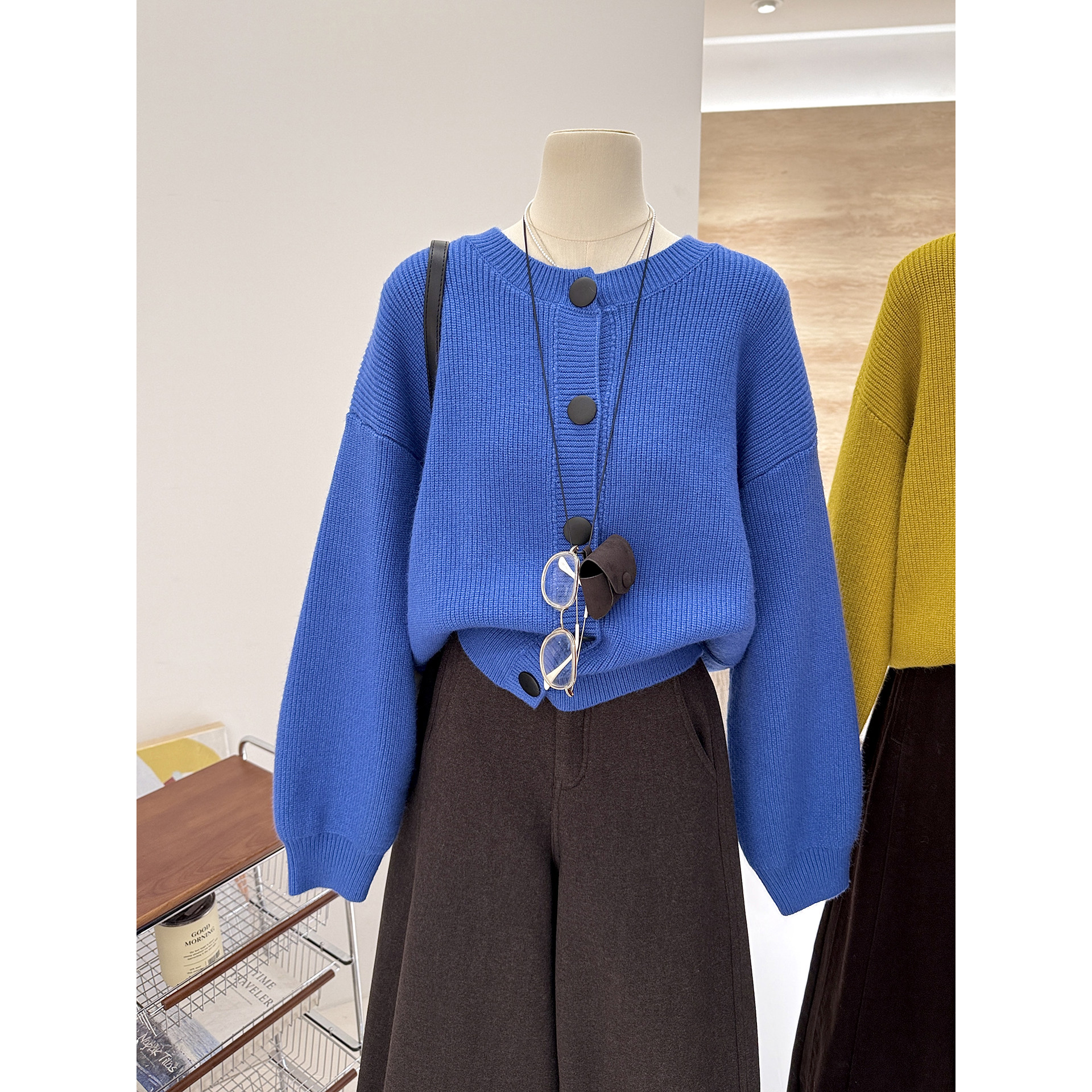 AZure温柔风羊毛针织开衫女复古宽松显瘦百搭通勤灯笼袖毛衣外套